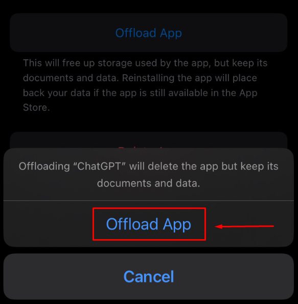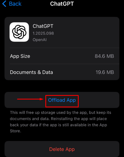 Step 6: Find desired app like ChatGPT and click “Offload App”